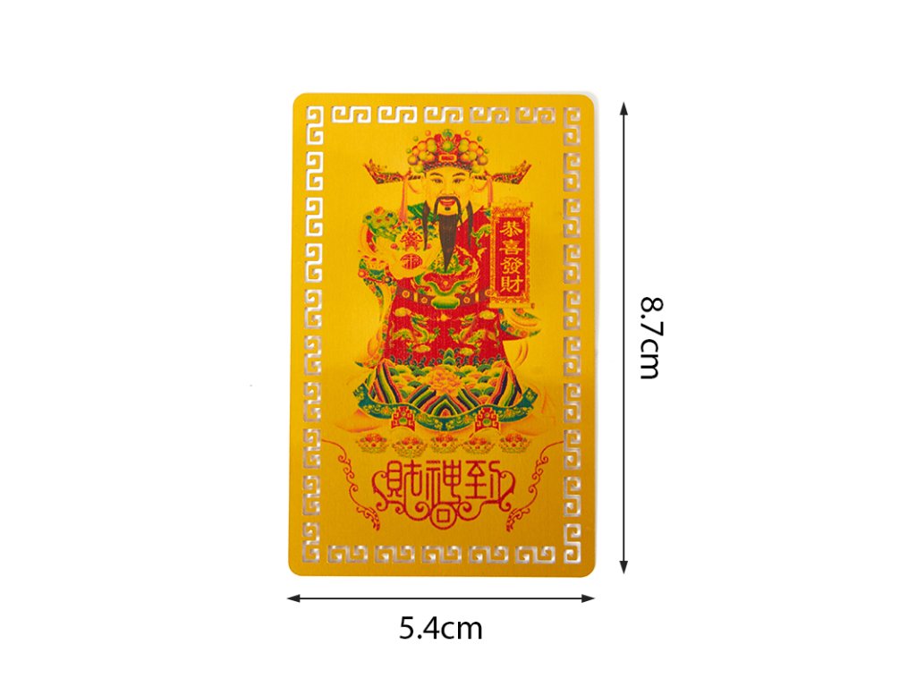 Zlatá karta BOHATSTVÍ je určena pro podporu hojnosti a bohatství v životě.. Na kartě je čínský bůh bohatství Cai shen a i zlatý ingot je symbolem bohatství a úspěchu. Noste tuto kartu talismanu přímo ve vaší peněžence, aby jste zvýšili příjmy z Vašeho zaměstnání nebo podnikání. Hlavně z peněženky vyndejte staré účtenky a složenky.