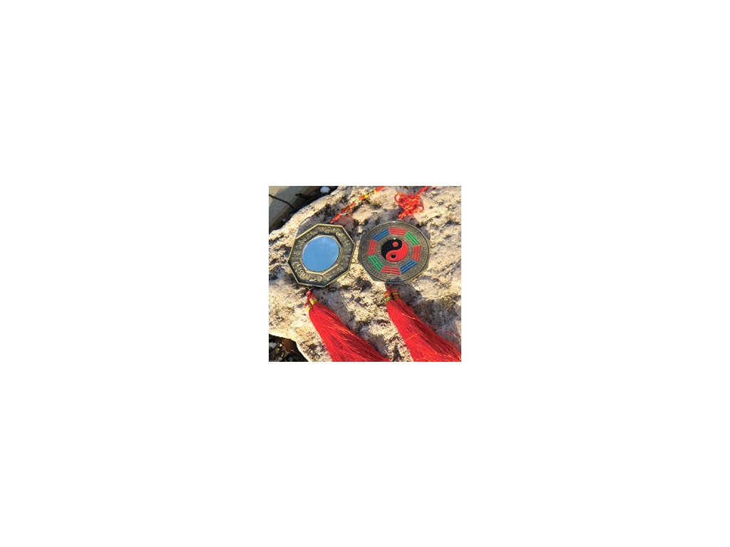 Osmiboký symbol Ba-gua se zrcátkem uprostřed. Mocný ochranný prostředek Feng shui. Na vnější straně zrcátko, na zadní ochranné trigramy a monáda Jin-jang. Luxusní provedení s ručně malovanou monádou a ochrannými trigramy. Průměr cca 9,5 cm.